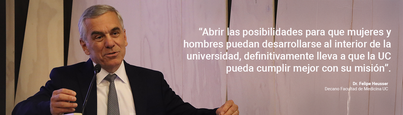 En esta jornada también se distinguió al Dr. Felipe Heusser con el reconocimiento ‘Compromiso con la equidad’ por la labor que ha tenido durante su decanatura en el impulso y respaldo de iniciativas que promueven la equidad, la participación y el desarrollo de una comunidad académica más inclusiva. Tras recibir este premio, el Decano destacó el trabajo colaborativo que se ha realizado dentro de la Facultad de Medicina en esta materia y señaló: “Abrir las posibilidades para que mujeres y hombres puedan desarrollarse al interior de la universidad, definitivamente lleva a que la UC pueda cumplir mejor con su misión”.