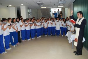 Imagen 7: Bendición de Instrumentos Primera Generación (2012) Tras la inauguración de CODUC, la primera generación de estudiantes de Odontología UC, quienes cursaban su cuarto año, recibieron la primera bendición de sus instrumentos odontológicos, dando paso a su etapa clínica.